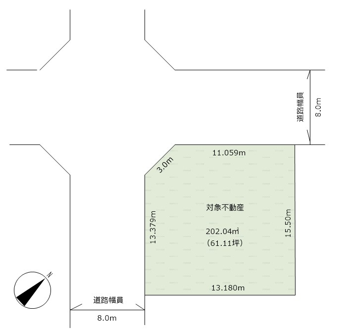 | 接道状況 | 北西 8.0m 公道 接面11.0m・南西 8.0m 公道 接面13.3m・二方道路 | 地目 | 宅地 |